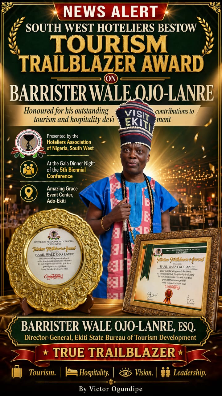 Director-General of the Ekiti State Bureau of Tourism Development, Barrister Wale Ojo-Lanre, has been honoured with the prestigious Tourism Trailblazer Award. This recognition, bestowed by the South West Hoteliers Association of Nigeria, celebrates his profound impact on Ekiti State tourism and his wider efforts to catalyse hospitality growth across the nation.
